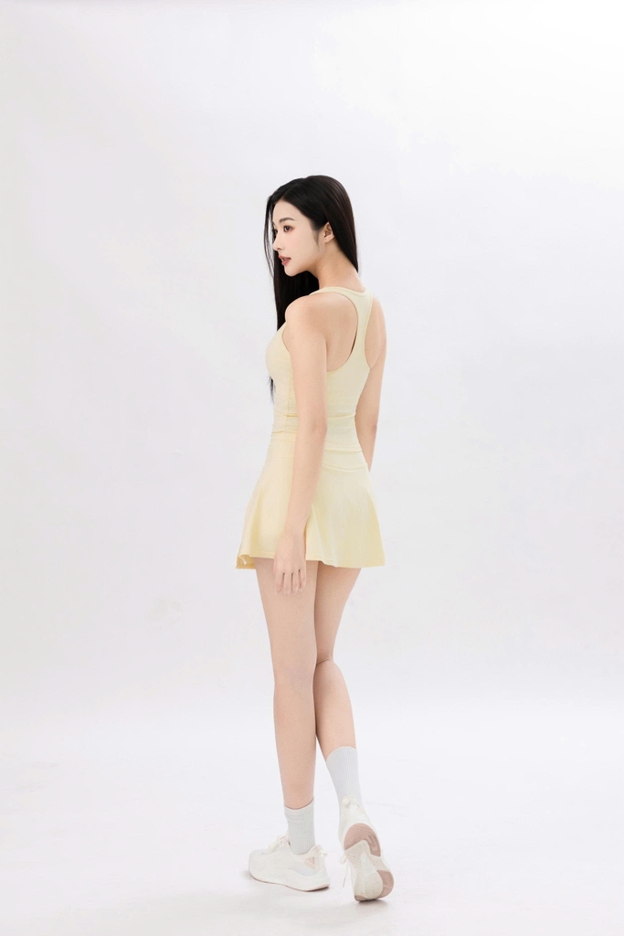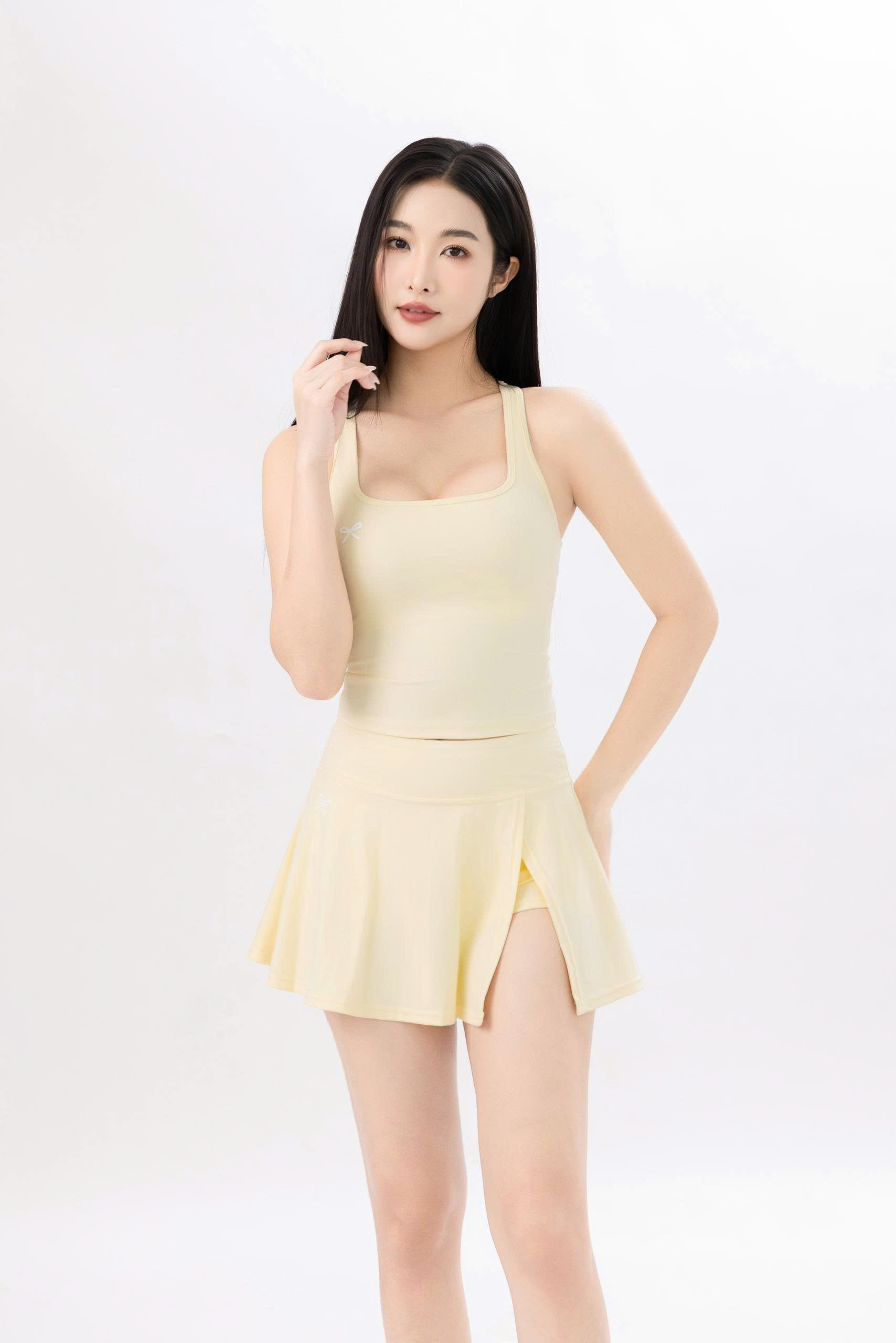 Thiết kế tối giản mà tinh tế: Áo tanktop ôm dáng phối cùng chân váy xẻ, kèm shorts bên trong để thoải mái vận động.
