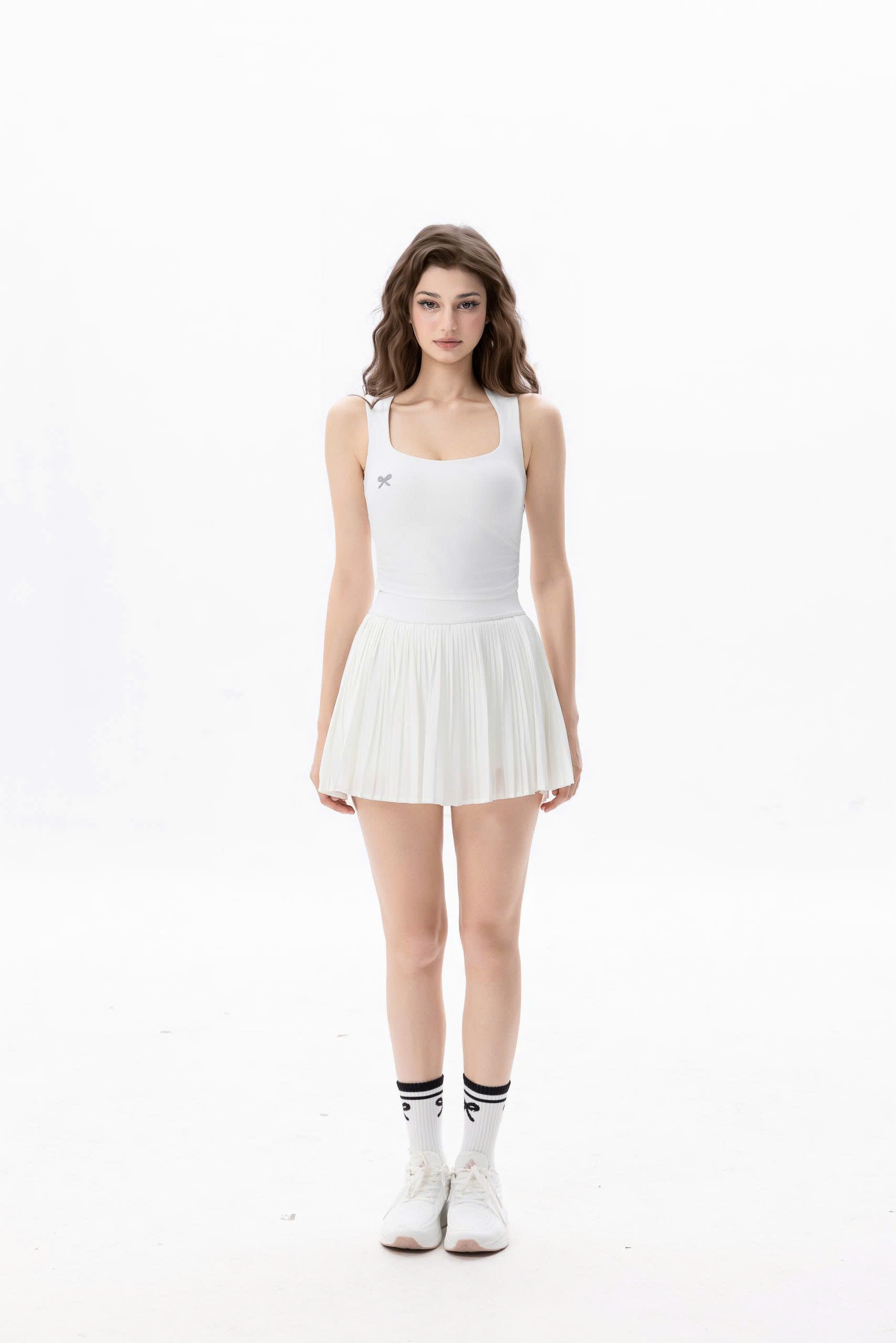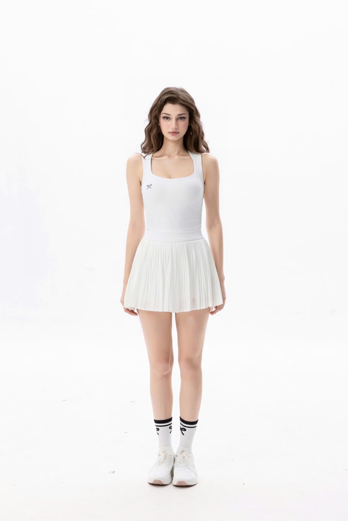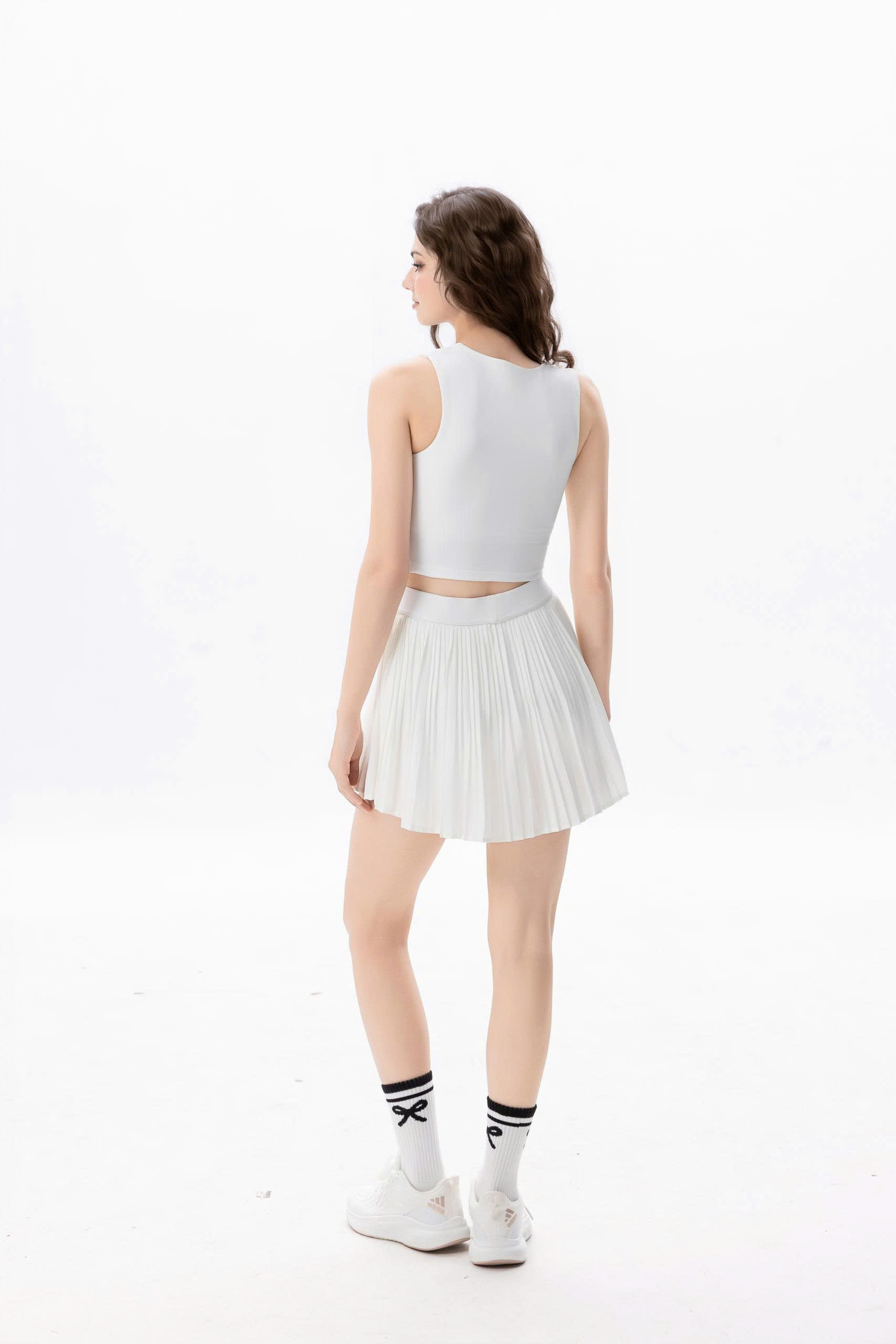 Thiết kế tối giản mà tinh tế: Áo croptop dáng thể thao với điểm nhấn 2 bên eo, chân váy xếp ly năng động